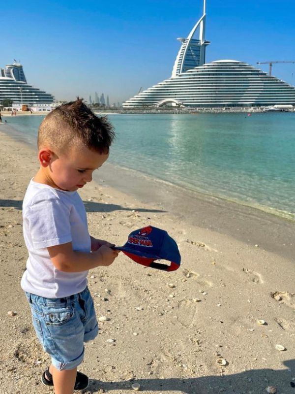 Naší první zastávkou byl Jumeirah Beach Park (parkování za 20 AED, což jsme samozřejmě zapomněli zaplatit, ale naštěstí si toho nikdo nevšimnul). Pláž byla téměř prázdná, takže jsme si dali kávu, nechali Jaydena si hrát v písku a vychutnali si výhled na ikonický Burj Al Arab, než jsme pokračovali dál.