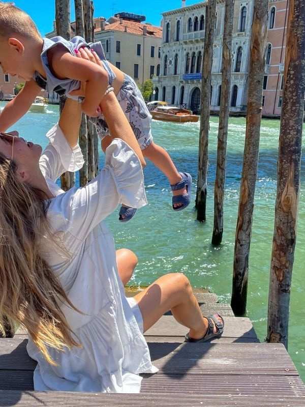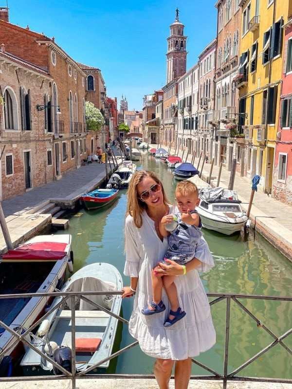 žena stojí na mostě přes kanál v Benátkách, drží malé dítě v náručí