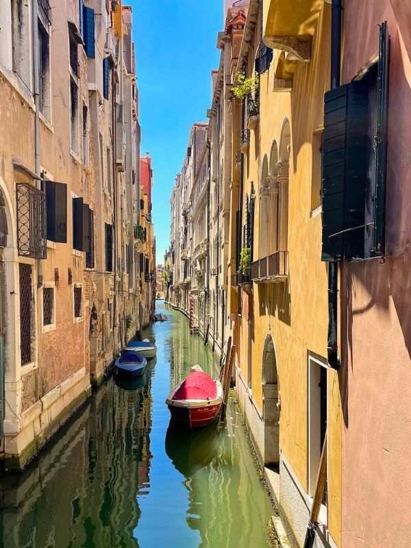loďky v kanálu v Benátkách, modrá obloha