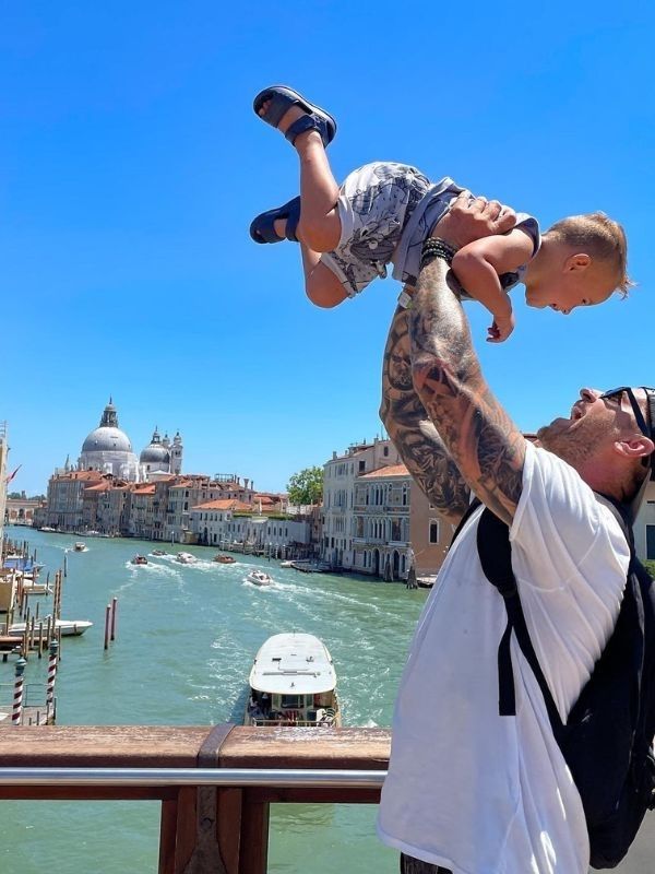 otec vyzdvihuje syna nad hlavu, za nimi je řeka s loděmi a italské město Benátky