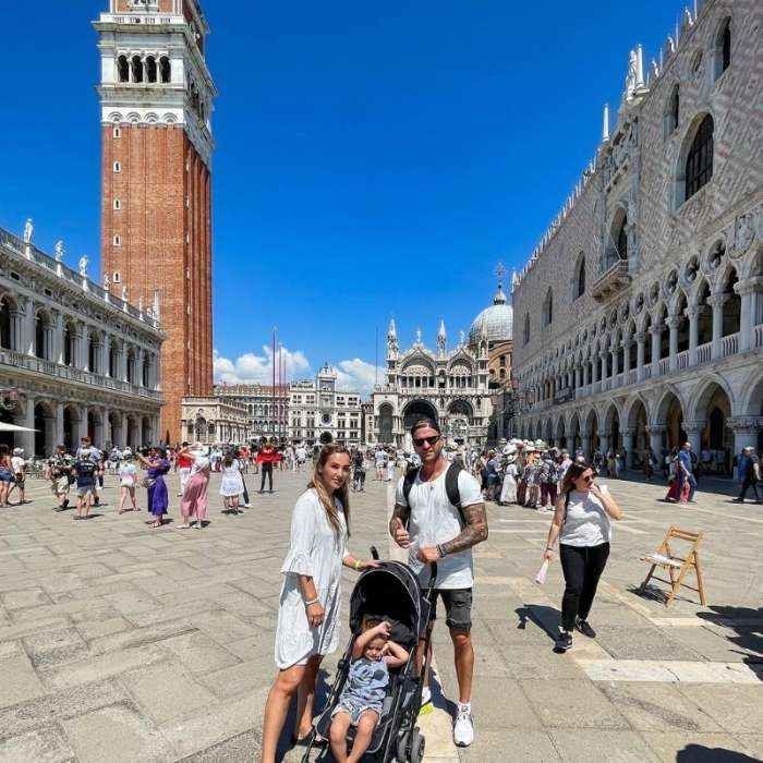 rodina pózuje pro fotku na náměstí svatého Marka v Benátkách
