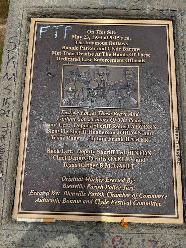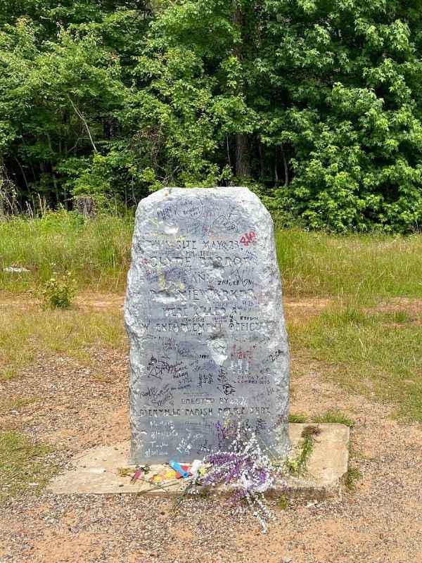 Pokrytý graffiti, poškozený sekerami a zasažený střelbou. Tento malý kamenný památník označuje místo přepadení a smrti Bonnie a Clydea. Jejich příběh je fascinující.