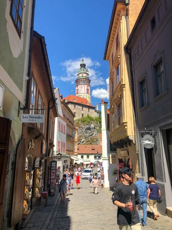 Věž hradu v pozadí úzké uličky v Českém Krumlově