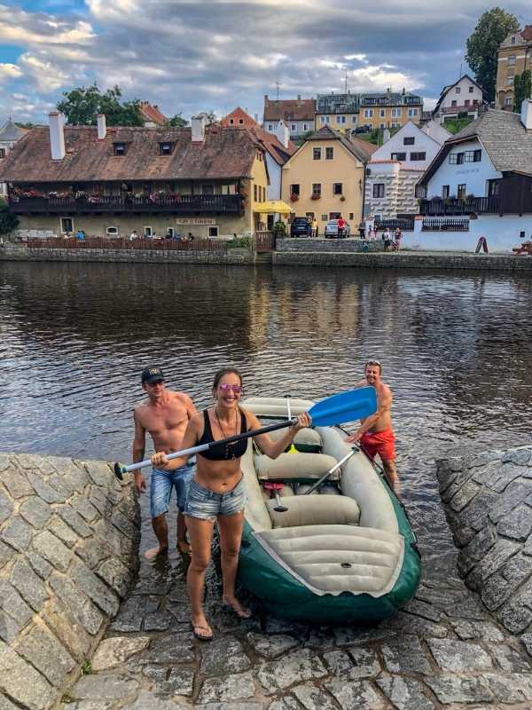 Muž s pádlem na raftu projíždí kolem domu na řece v Českém Krumlově