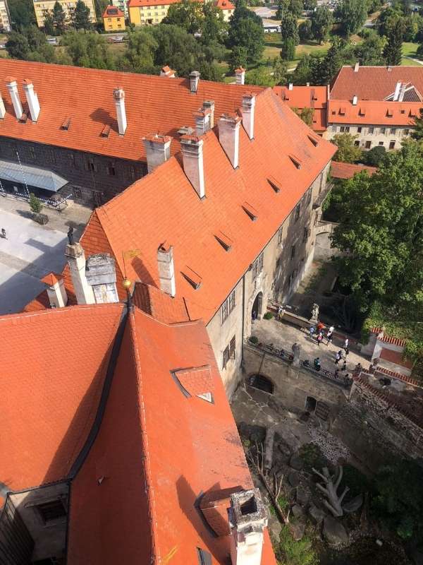 Dlouhé červené střechy budov v Českém Krumlově
