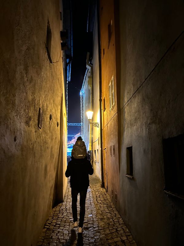 Muž nese dítě na ramenou a prochází úzkou ulicí po setmění v Chebu.