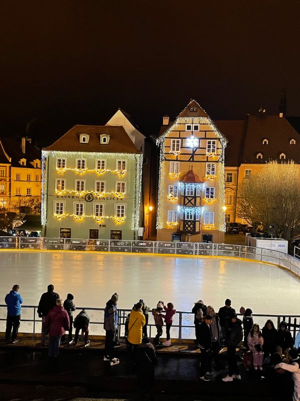 Kluziště postavené na náměstí v Chebu s osvětleným Špalíčkem v pozadí.