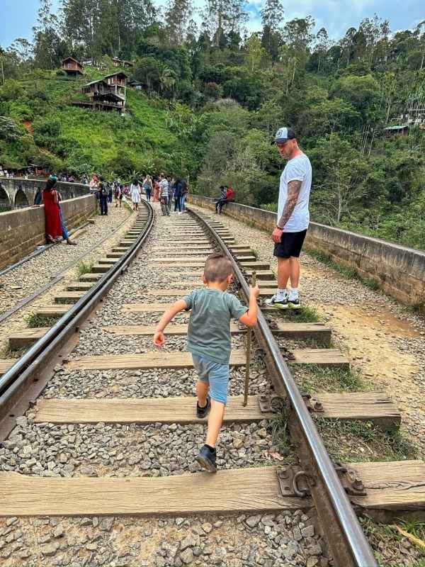 chlapec jde po kolejích v Elle na Srí Lance, otec ho pozoruje