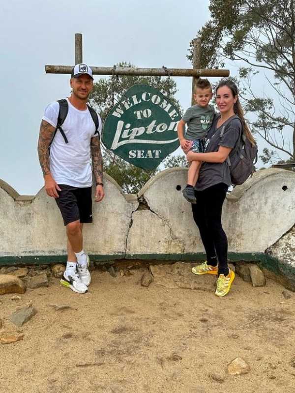 muž a žena pózují vedle nápisu Welcome to Lipton Seat na Srí Lance