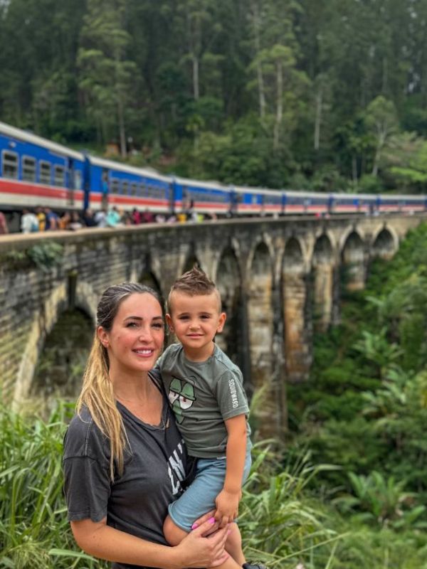 matka drží syna v náručí, za nimi je devítiklenutý most a modročervený vlak typický pro Srí Lanku