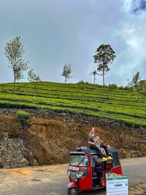 žena a dítě sedí na střeše tuk-tuku, za nimi čajové plantáže