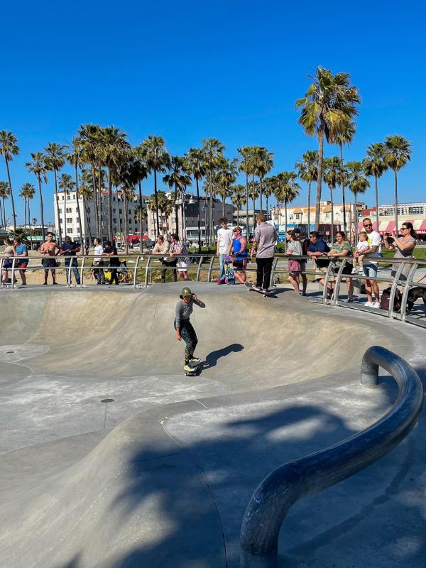 O víkendech je Venice Beach obzvlášť živá, se skateboardisty, rodinami a občas ucítíte kouř marihuany. Můžete tu strávit hodiny procházkami, jízdou na kole nebo na kolečkových bruslích podél pobřeží. Půjčte si kolo nebo skútr přímo na promenádě a vydejte se na projížďku do Marina Del Rey nebo Santa Moniky.