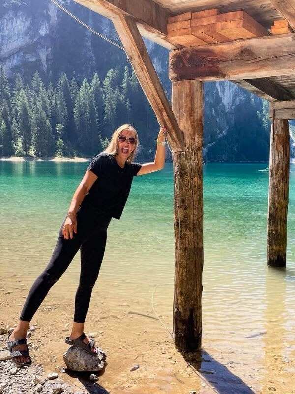 žena se radostně opírá o kulatý kámen u Lago di Braies