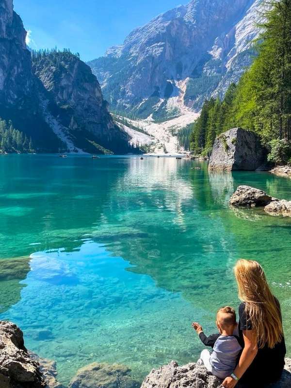 matka a syn sedí na kameni a sledují hladinu Lago di Braies, za jezerem se tyčí hory