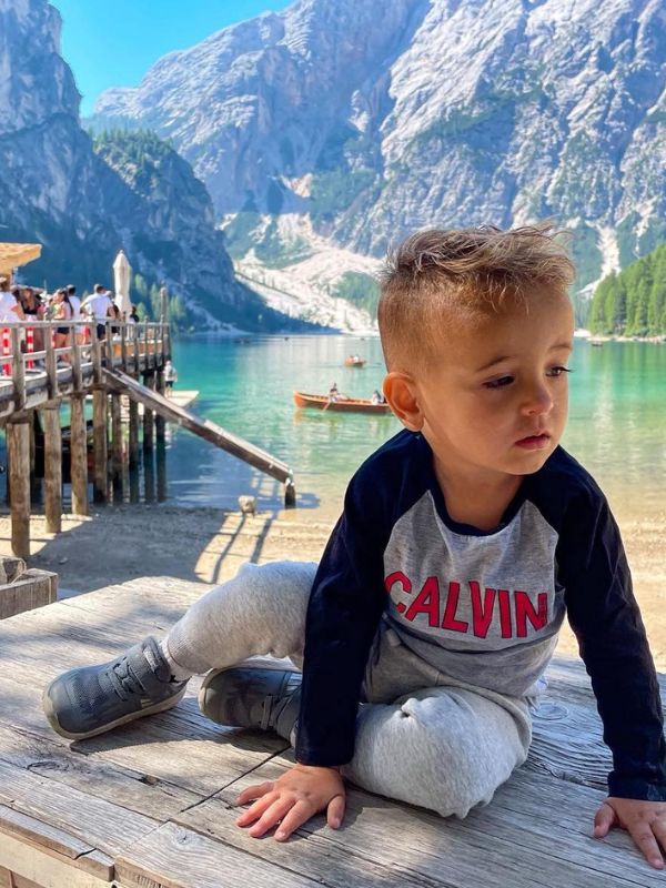 malé dítě sedí na dřevěné podlaze, za ním průzračné jezero a hory