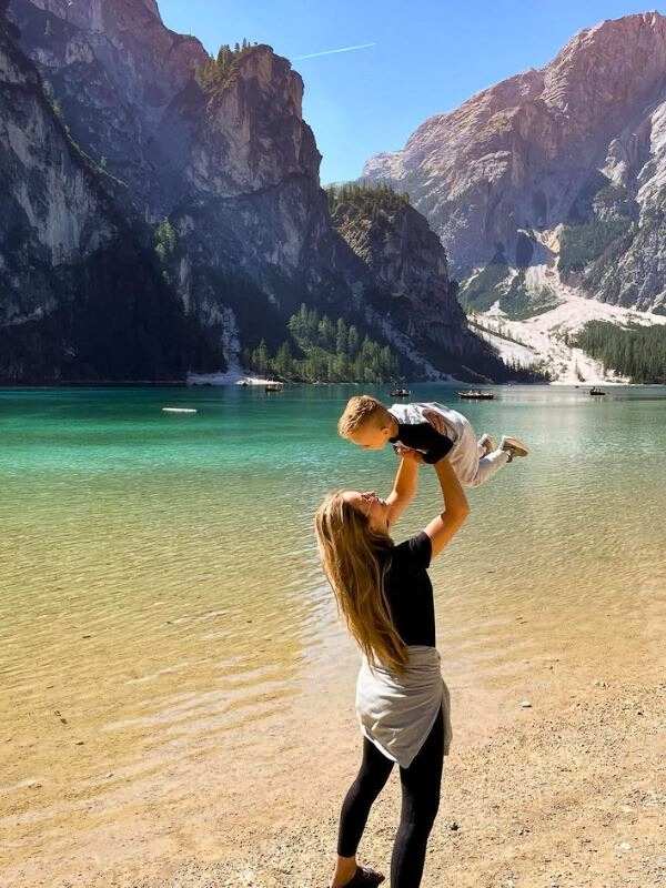 matka radostně zvedá syna na pláži u Lago di Braies v Itálii