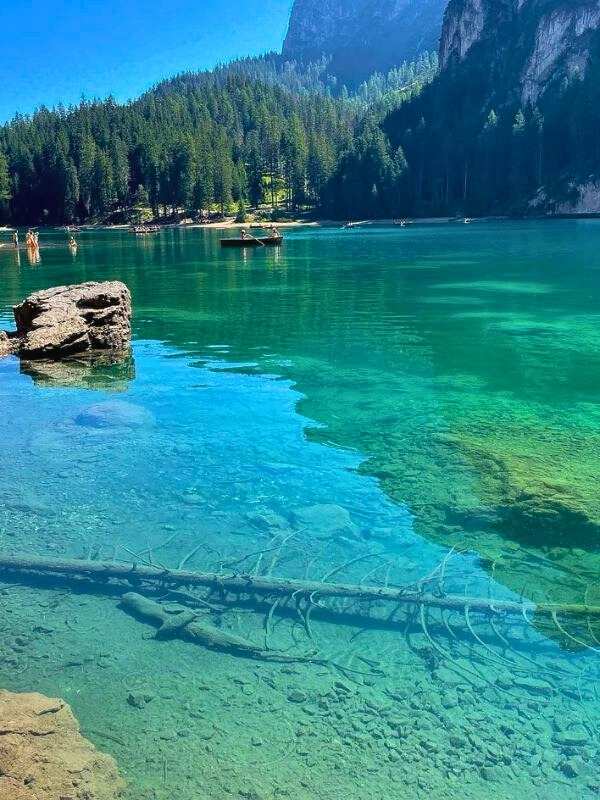 průzračná voda u Lago di Braies, kde je vidět dno, lodka v pozadí