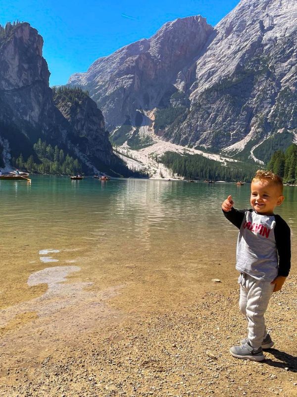 malý chlapec ukazuje prstíkem a směje se na pláži u Lago di Braies