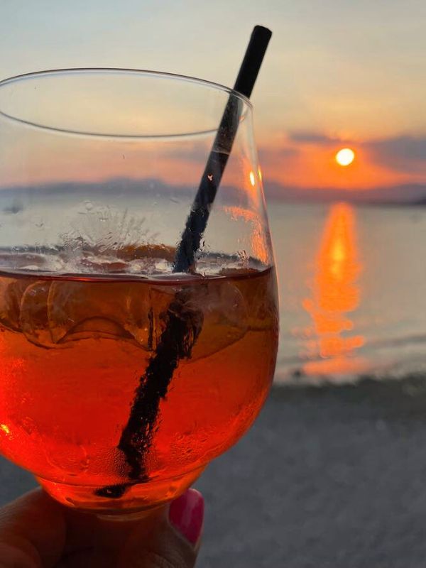 **Sklenice Aperolu při západu slunce v Bardolinu.**