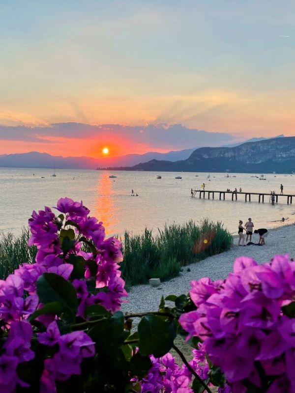 **Západ slunce nad jezerem Garda, dřevěné molo a keř s fialovými květy.**