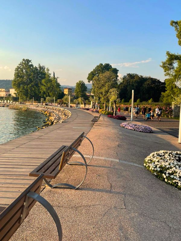 Uprostřed východního pobřeží jezera nás Garda okouzlila svou živou promenádou, barevnými budovami a rušnou atmosférou. Protože to bylo jen 10 minut chůze od našeho kempu, často jsme sem chodili na večeře a pozdní odpolední procházky.
