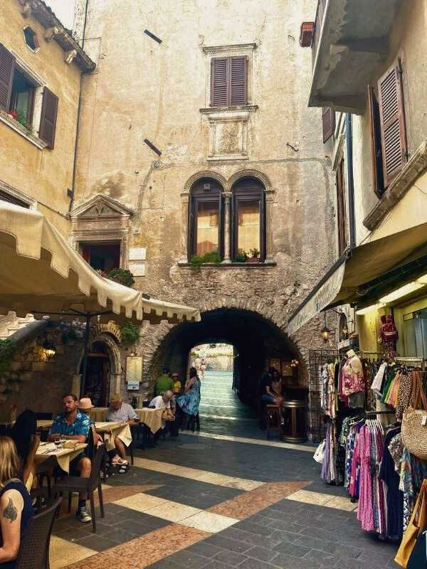 Restaurace v Gardě, kamenné stavby s průchozím obloukem a venkovní obchůdky.