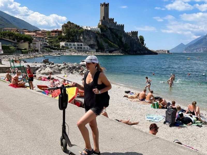 **Žena na koloběžce na pláži plné lidí, v pozadí hrad Malcesine.**