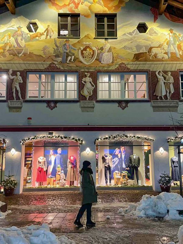 Osoba před domem s kresbami, sníh v Garmisch-Partenkirchenu.